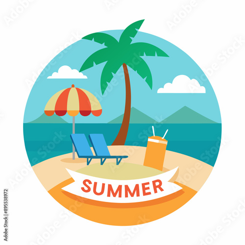 © khafid, Naklejka premium Summer design with sunglasses and palm at island with white background for your Tshirt design, Apparel or your event background