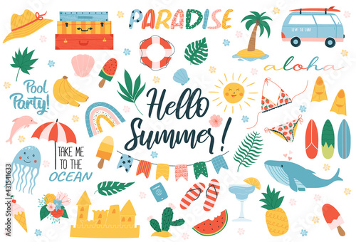 Naklejka premium Summer elements set: ice cream, dolphin, beach, watermelon, surfboard,...