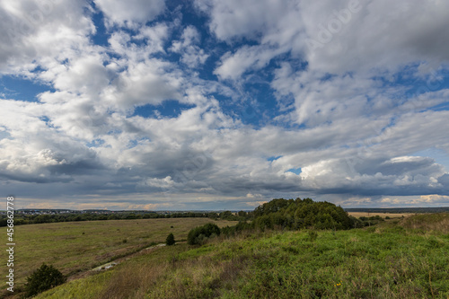 © Sergei, Fototapeta premium Summer field and clouds on the blue sky. A landscape with a bright green field and dramatic clouds against a blue sky.