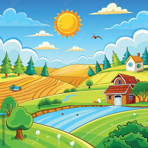 © MD, Fototapeta premium Summer Field Countryside Landscape Illustration | Sunny Day Cartoon Rural Scenery