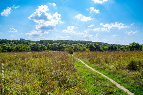 © Николай Батаев, Obraz premium Summer field with a narrow path trodden by people. A path in a clearing with low grass