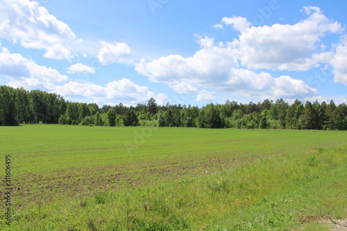 Obraz premium Summer field with trees under a blue sky, with clouds.