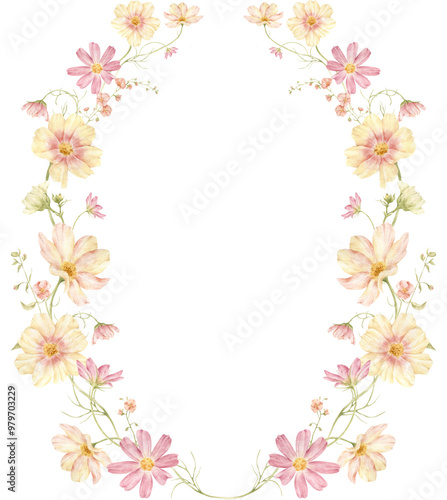 Fototapeta premium Summer floral wreath. Watercolor branch with cosmos flowers