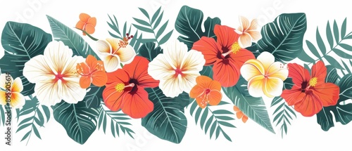 Fototapeta premium Summer flowers, hibiscus and plumeria motifs, flat design illustration