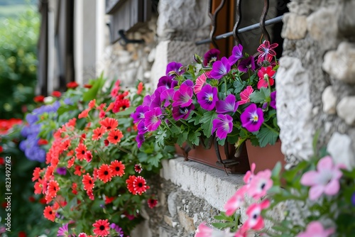Fototapeta premium Summer flowers in pots on the window of an old house.
