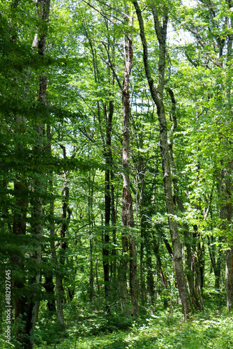 Fototapeta premium Summer forest. Hiking in the mountains, green forest.