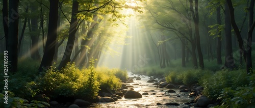 Obraz premium Summer forest landscape with sunbeams breaking through dense foliage and a babbling brook in the foreground