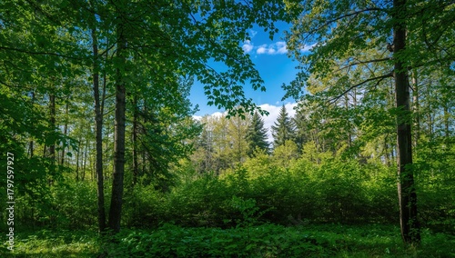 Fototapeta premium Summer forest scene with lush greenery, ideal for relaxation and nature...