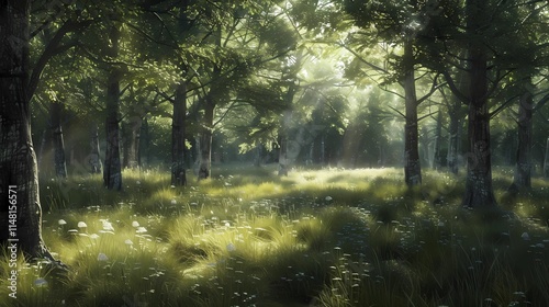 © Charm Pixel, Obraz premium Summer Forest with Dappled Sunlight