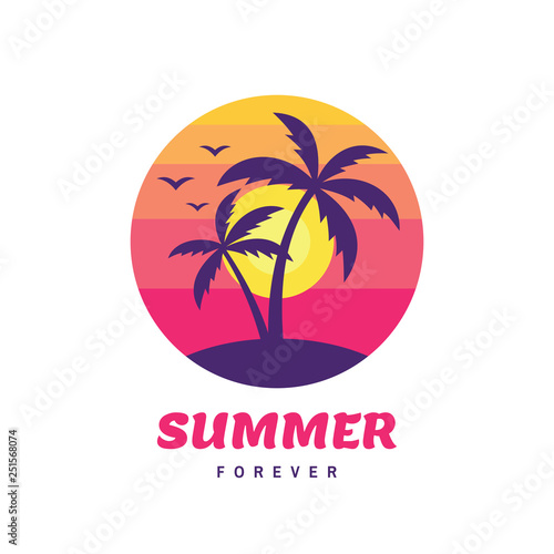 © serkorkin, Fototapeta premium Summer forever - concept business badge vector illustration in flat style. Tropical holiday paradise creative logo. Palms, beach, sunset. Travel web banner or poster.