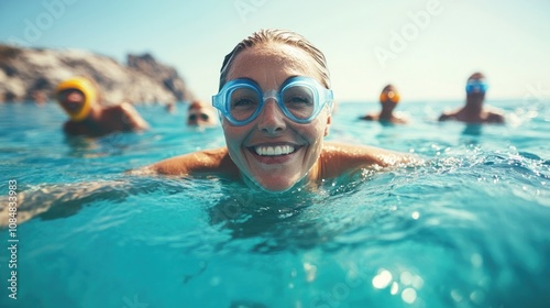 Naklejka premium Summer Fun: A Smiling Woman Enjoys a Refreshing Swim with Friends in the Crystal-Clear Ocean