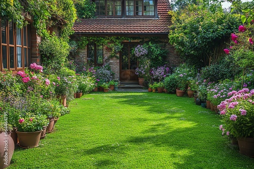 Naklejka premium Summer Garden with Flowers and House.
