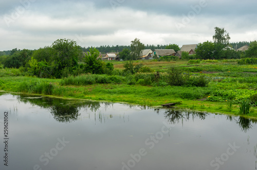 Fototapeta premium Summer gloomy landscape with Kotelva river in Kotelva village, Poltavskaya oblast, Ukraine