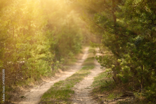 Naklejka premium Summer green forest with path and sun shining, natural outdoor seasonal...