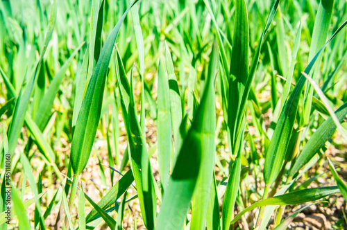 © Payllik, Fototapeta premium Summer green grass closeup. Large leaves. Agricultural field with plants in the sun. Background for graphic design of agro booklet.