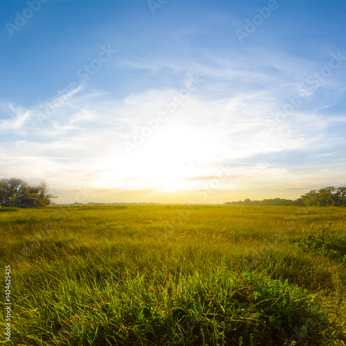 © Yuriy Kulik, Obraz premium summer green prairie with wild flowers at the sunset