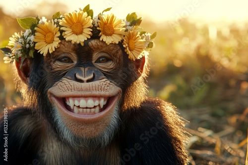 © A, Fototapeta premium Summer happiness. Cute adult animal chimpanzee wearing untamed flower wreath on its head. Golden hour in sunset. Wild animal with natural beauty. Graceful wild creature in bloom.