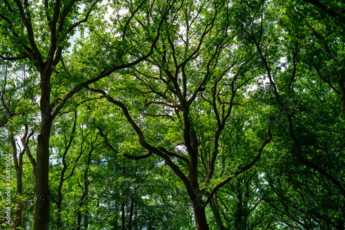 Fototapeta premium Summer hiking in old oak forest with large trees