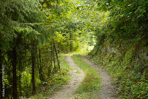 © Zarina Lukash, Fototapeta premium Summer hiking trail winding through lush green deciduous forest landscape