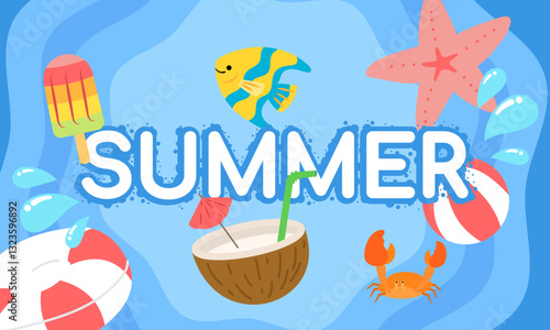 Naklejka premium Summer holiday illustration with popsicle, tropical fish, starfish, coconut drink, beach ball and crab