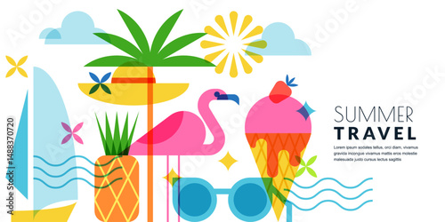 © Qualit Design, Naklejka premium Summer holiday, travel, vacation geometric background with sunglasses, ice cream, palm, flamingo. Vector illustration