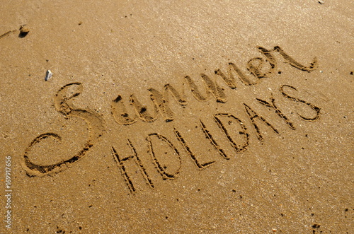 Fototapeta premium SUMMER HOLIDAYS hand lettered in sand on beach with shells