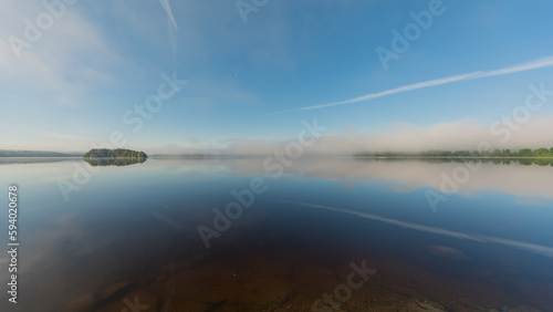 © Jani Katajisto, Obraz premium Summer lake scenery with clouds and mist reflected on the water in Finland
