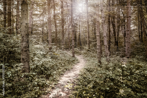 © Volodymyr, Obraz premium summer landscape: a forest with thick trees, through the trees the sun shines