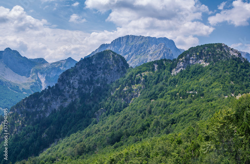Fototapeta premium Summer landscape – Albanian mountains, covered with green trees, clouds on blue sky.