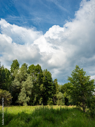 © Rafail, Fototapeta premium Summer landscape featuring lush trees under a partly cloudy sky, vibrant greenery and moody clouds, copy space