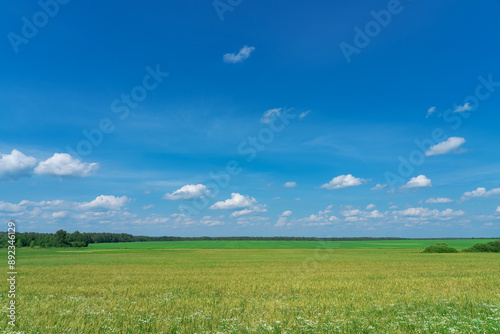 © Елена Челышева, Fototapeta premium summer landscape, field with green grass and horizon, textured sunset sky, sun