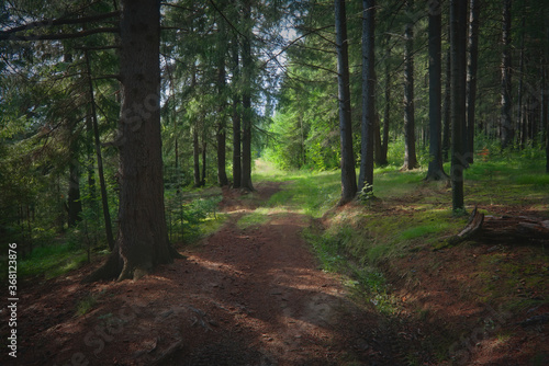 © Anatoliy, Obraz premium Summer landscape footpath in spruce forest on.