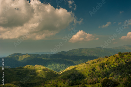 Fototapeta premium Summer landscape. Green hill and blue sky in forest Thailand