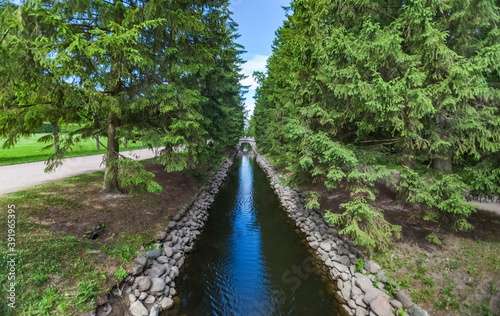 Obraz premium Summer landscape in a city Park with trees, grass, river, sky with clouds