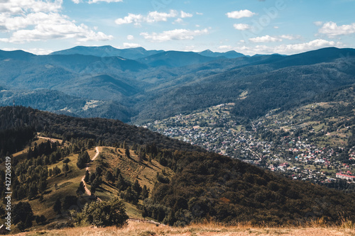 © serbogachuk, Fototapeta premium Summer landscape in mountains and the dark blue sky with clouds