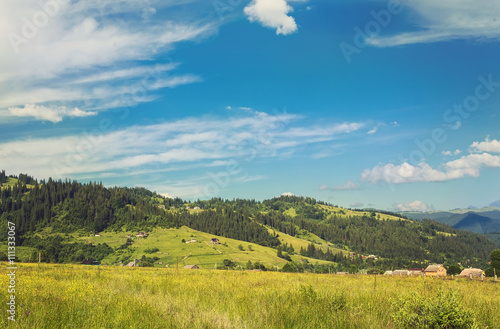 © Ryzhkov Oleksandr, Fototapeta premium Summer landscape in mountains and the dark blue sky with clouds. Retro color.