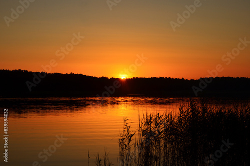 Obraz premium summer landscape in warm colors sunset on a lake surrounded by forest