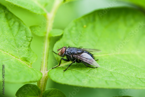© golubka57, Fototapeta premium Summer landscape. Insect fly on green leaf, macro