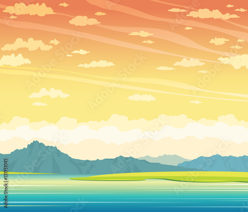 Fototapeta premium Summer landscape - lake, mountains, sunset sky.