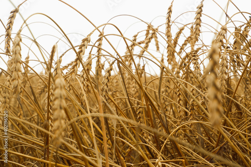 © Trik, Fototapeta premium Summer landscape of wheat field. Ripe cereals field. Golden spikelets of ripe wheat close up