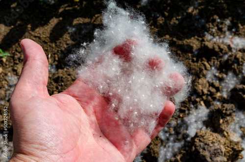 © Dmitry, Naklejka premium Summer landscape. Poplar fluff. Poplar fluff is to blame for allergies, summer begins with poplar fluff. Magic poplar.