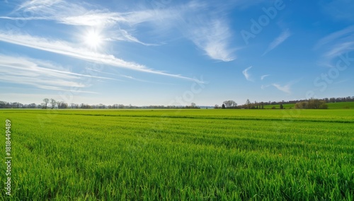 Fototapeta premium Summer landscape scene with lush green grass, clear blue sky, and bright...