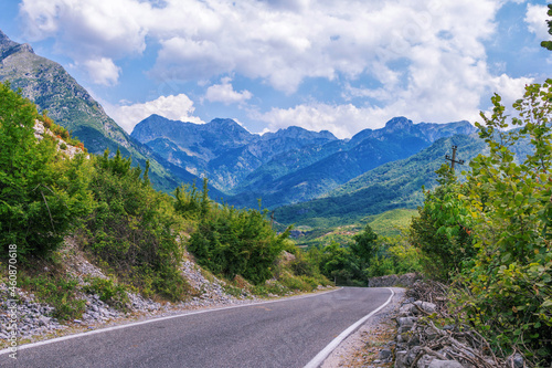 Fototapeta premium Summer landscape - valley and road in Albanian mountains, green trees and...