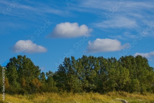 Obraz premium Summer landscape. White clouds. Green trees.