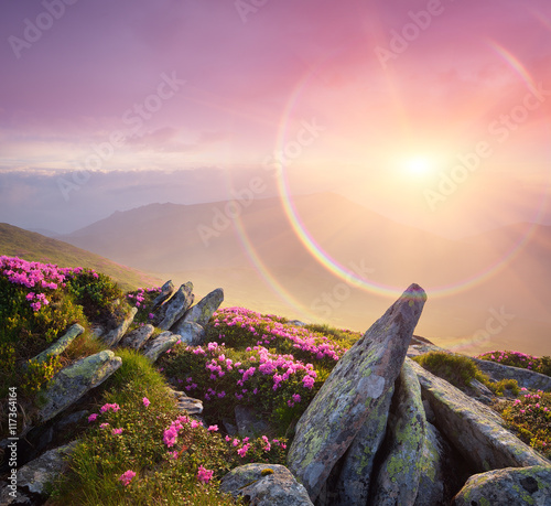 Naklejka premium Summer landscape with a beautiful sunrise and mountain flowers