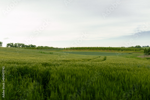 © VikaNorm, Fototapeta premium Summer landscape with a field of green wheat.