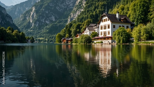© claudunia, Naklejka premium Summer landscape with a lake and a white house in Hallstatt, Austria.