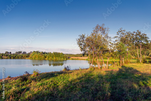 Fototapeta premium Summer landscape with a pond, trees and grass on the banks against a blue sky...