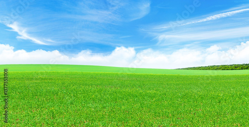 Fototapeta premium Summer landscape with a vast green field under a majestic sky