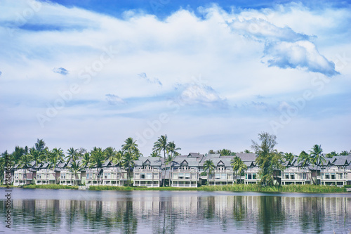 Obraz premium Summer landscape with beautiful cottages on the lake shore.